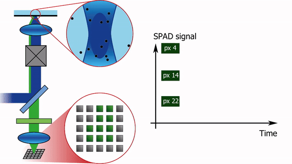 To address this limitation, we recently built a confocal laser scanning microscope in which the traditional single-element detector was replaced with a 5x5 pixel single-photon-avalanche-diode (SPAD) array detector, see Figure 1. Each pixel of the detector produces almost instantaneously a logical-high voltage when hit by a fluorescence photon. Consequently, for each pixel, the arrival time of every photon can be registered with sub-nanosecond temporal resolution, independently from and asynchronously with respect to the other pixels. In combination with a pulsed laser source, such a setup offers the additional advantage of being able to simultaneously measure the fluorescence lifetime.
