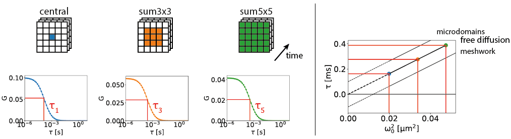 The high-resolution spatial and temporal information can be analyzed in several different ways. E.g. the FCS detection volume can be chosen in post-processing by summing the intensity traces of multiple pixels. One can for example calculate three intensity traces, I_12(t), I_sum3x3(t), and I_sum5x5(t). I_12(t) is the intensity trace of the central pixel, I_sum3x3(t) the trace of the nine most central pixels, and I_sum5x5(t) the sum of all pixels. I_12(t) will then correspond to an FCS experiment with a diffraction-limited focal volume, I_sum3x3(t) with a slightly larger focal volume, and I_sum5x5 with an even larger one. Analysing the diffusion time, i.e. the average time a molecule spends in the focal volume, as a function of the focal volume size gives information on the type of diffusion: free diffusion produces a proportional relationship between the diffusion time and the square of the size of the focal volume, while microdomains in the sample or diffusion through a meshwork result in a different relationship, as shown in Figure 2.